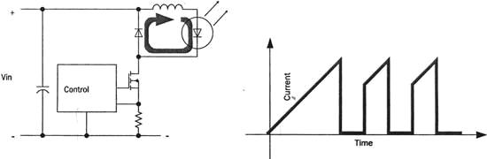 最簡單的開關穩(wěn)壓器是圖2所示的降壓穩(wěn)壓器,輸入電壓與LED電壓之間的壓差對電感L充電,電流隨之增加,當電流達到預設的值時,控制電路將串聯(lián)的晶體管關閉,在LED通路形成一個交變電流。注意,在LED驅動應用中,開關穩(wěn)壓電路控制電流的峰值。