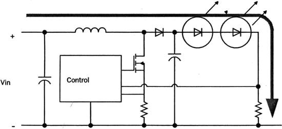 如果電源電壓低于所有LED串聯(lián)電壓和,就要選用升壓穩(wěn)壓器。升壓穩(wěn)壓器(圖3)既要控制電流,又要控制電壓,電路相對復雜些。升壓穩(wěn)壓器在大電流情況下同樣存在嚴重的干擾問題。因而最穩(wěn)定又最安全的LED驅動器可采用升壓與降壓相結合的形式。一個升壓穩(wěn)壓器可驅動幾個并聯(lián)的降壓穩(wěn)壓器。這樣,面對電源的是性能良好的升壓穩(wěn)壓器,而在負載端則是高電流輸出的降壓穩(wěn)壓器。