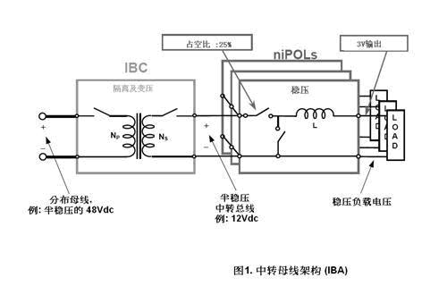 IBA的理念是把母線電壓降至一個(gè)稍稍高于負(fù)載點(diǎn)的電壓,再由較便宜的降壓器(niPoL)來完成余下的工作。降壓器(niPoL)經(jīng)由電感器傳輸電壓到負(fù)載,這電壓相等于上開關(guān)和下開關(guān)共同端電壓的平均值,等如上開關(guān)電壓占空比與中轉(zhuǎn)母線的乘積。