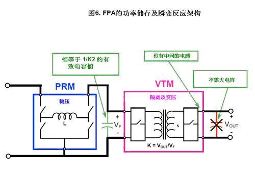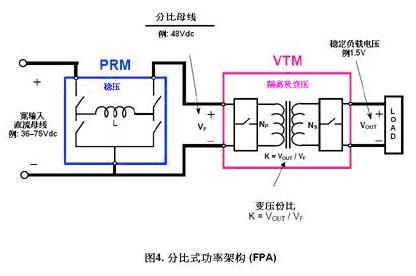 跟分布式架構(gòu)或中轉(zhuǎn)母線架構(gòu)不一樣,在分比式架構(gòu),穩(wěn)壓功能由PRM提供,可遠(yuǎn)離負(fù)載。VTM作為負(fù)載點(diǎn)的轉(zhuǎn)換器,它不需要提供穩(wěn)壓的功能,?可以無須靠近負(fù)載。它只負(fù)責(zé)按K比值“倍大電流”或“降低電壓”(VOUT=VfK),VTM可在整個(gè)轉(zhuǎn)換周期傳送電流,它的占空比是百份之一百。FPA以分比母線傳輸功率,可以較隨意的選擇電壓,無須如前所述的IBA架構(gòu),因固有的沖突,中轉(zhuǎn)電壓只能選定在稍高于負(fù)載的電壓,否則它的占空比將無法管理。