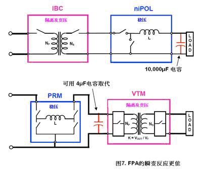 FPA的瞬變反應(yīng)較IBA理想。如前述,IBA把電感器放在中轉(zhuǎn)母線與負(fù)載之間,產(chǎn)生電流慣性。在FPA分比母線與負(fù)載之間沒有電感器(圖6),由于VTM不受電感慣性左右,可快速的反應(yīng)負(fù)載變化。在分比母線的電容由于沒有電感的阻隔,可對負(fù)載有效旁路,該電容相等于在負(fù)載加上1/K2倍電容值,這便無須在負(fù)載點(diǎn)加上大電容。圖7清楚表示在FPA只需用上4uF的電容便可以取代IBA中的10000uF電容。