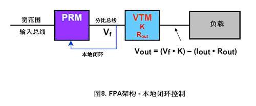 本地閉環(huán)(圖8)是最簡單的方法。PRM感應(yīng)它自己的輸出電壓,再調(diào)整及維持分比母線電壓在一個(gè)常數(shù)。負(fù)載電壓按VTM的輸出阻抗的比例升降(VfK-IoutRout)。一個(gè)PRM可同時(shí)連接多個(gè)VTM。