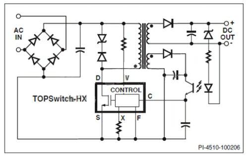 TOPSwitch-HX在單個IC封裝中集成了一個700VMOSFET、MOSFET柵極驅(qū)動和一個用戶可選擇限流點的PWM控制器。在使能狀態(tài)下,控制器的振蕩器在每個時鐘周期開始時導(dǎo)通功率MOSFET。當電流達到限流點或達到反饋信號設(shè)置的占空比(PWM控制)時,MOSFET才會關(guān)斷。PWM控制器關(guān)斷MOSFET后,變壓器繞組間的電壓開始反向,輸出二極管被正向偏置,電流開始流入次級繞組,從而補充輸出電容中的電荷并將電流供應(yīng)給負載。
