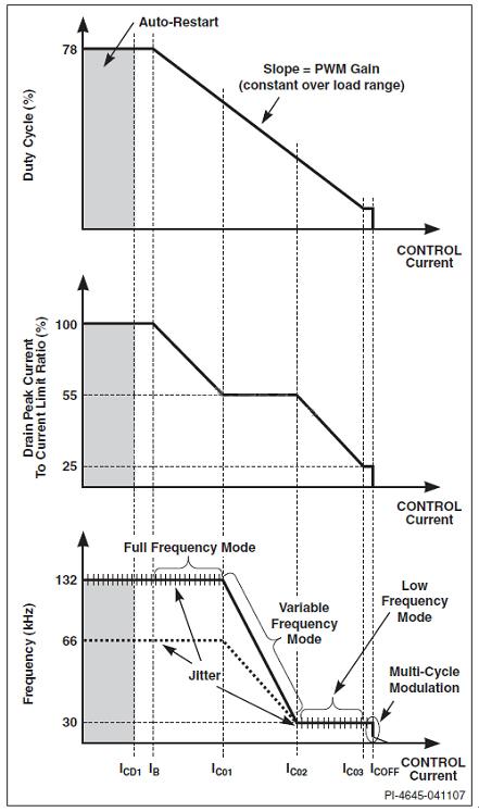 隨著電源負載進一步降低和開關(guān)頻率達到30kHz,TOPSwitch-HX將切換至固定低頻PWM模式。在此模式下,通過調(diào)整MOSFET導(dǎo)通時間,可使開關(guān)頻率保持在音頻波段以上并維持輸出穩(wěn)壓。開關(guān)頻率保持恒定不變且占空比減小,工作方式與全頻PWM模式相同,都通過縮短MOSFET導(dǎo)通時間來實現(xiàn)。峰值漏極電流從初始的最大值下降到最小值,即設(shè)定流限值的25%,這樣可以在低功率時保持高效率,避免音頻噪聲問題。