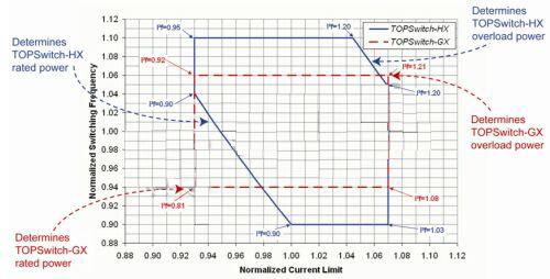 TOPSwitch-HX已解決了上述難題。TOPSwitch-HX引入額外的電路,并在最終測試中采用參數(shù)調(diào)整技術(shù),以控制開關(guān)頻率與流限值平方的乘積的最大值和最小值,這在數(shù)據(jù)手冊中用一個新的參數(shù)來表征,即功率因數(shù)(I2f)。