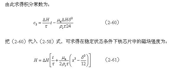 圖2-21就是用來求鐵氧體圓柱體變壓器鐵芯內(nèi)某截面磁場分布的原理圖,圖中虛線表示交變磁場在變壓器鐵芯內(nèi)部感應(yīng)產(chǎn)生渦流。我們用同樣的方法,從(2-59)開始對表示磁場分布的(2-58)式進(jìn)行積分求平均值,然后求出積分常數(shù)c2,即可以求得圓柱體鐵芯內(nèi)的磁場分布式: