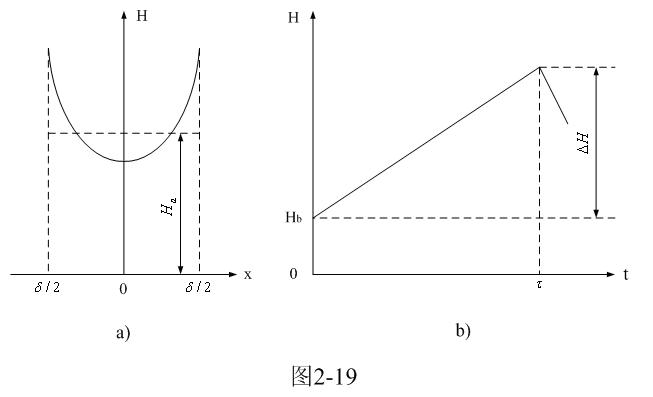 [page]圖2-19-a和圖2-19-b分別是由(2-61)式給出的,鐵芯片中磁場強(qiáng)度按水平方向分布的函數(shù)H(x)和按時間分布的函數(shù)H(t)曲線圖。