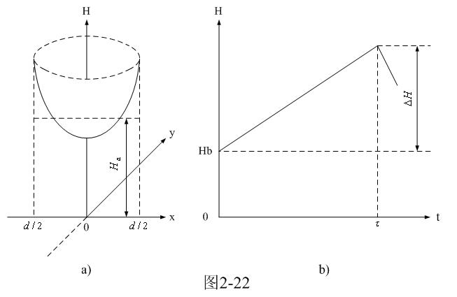 圖2-22-a和圖2-22-b是圓柱形鐵芯中磁場強(qiáng)度按水平分布的函數(shù)H(x,y)曲面圖和按時間分布的函數(shù)H(t)曲線圖。