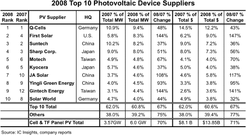 供應(yīng)量位居第三的是上年排名第二的尚德太陽能電力有限公司(Suntech Power Holdings),上年排名第三的夏普以與尚德的0.2個百分點之差下滑至第四。不過,在銷售額方面夏普位居第三,尚德以0.1個百分點之差退居第四。IC Insights評價夏普的薄膜硅太陽能電池增產(chǎn)及擴大銷售的計劃“很有野心”,并預(yù)測如果按照計劃推進,夏普將有望盡快奪回市場份額。