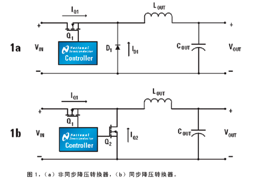圖1是非同步和同步降壓轉(zhuǎn)換器的原理圖。非同步降壓轉(zhuǎn)換器使用FET和肖特基二極管作為開(kāi)關(guān)器件(圖1a),當(dāng)FET打開(kāi)時(shí),能量傳遞到輸出電感和負(fù)載。當(dāng)FET關(guān)斷,電感中的電流流過(guò)肖特基二極管。如果負(fù)載電流高于輸出電感的紋波電流的一半,則轉(zhuǎn)換器工作在連續(xù)導(dǎo)通模式。
