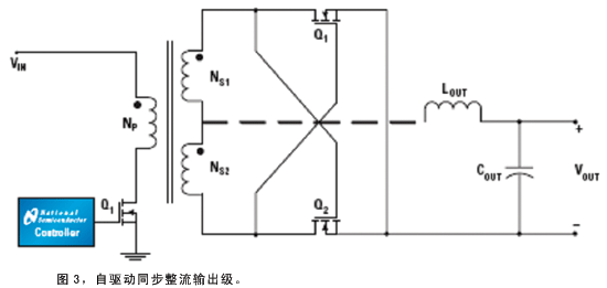 自驅(qū)動(dòng)方案是最簡(jiǎn)單、直接的SR驅(qū)動(dòng)方案(圖3),適合于那些在任何時(shí)間段內(nèi)變壓器電壓都不為零的拓?fù)浣Y(jié)構(gòu)。兩個(gè)SRFET可替代輸出整流二極管,次級(jí)繞組產(chǎn)生的電壓驅(qū)動(dòng)SR的柵極。在大多數(shù)情況下,利用不同的變壓器線圈匝數(shù)比(NP∶NS1∶NS2)和正確選擇SRFET,相同的拓?fù)浣Y(jié)構(gòu)可以獲得更高或更低的輸出電壓。