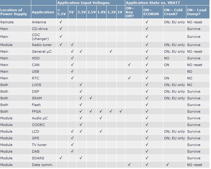 大多數(shù)系統(tǒng)電源的基本架構(gòu)選擇應(yīng)從電源要求以及汽車廠商定義的電池電壓瞬變波形入手。對于電流的要求應(yīng)該反映到電路板的散熱設(shè)計(jì)。表1歸納了大多數(shù)設(shè)計(jì)的電路及電壓要求。