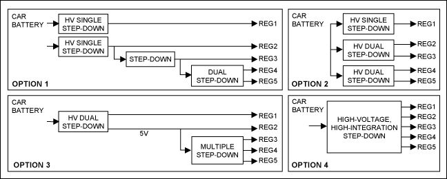以下列出了四種常用的電源架構(gòu),總結(jié)了最近三年汽車領(lǐng)域的典型設(shè)計(jì)架構(gòu)。當(dāng)然,用戶可以通過不同方式實(shí)現(xiàn)具體的設(shè)計(jì)要求,多數(shù)方案可歸納為這四種結(jié)構(gòu)中的一種。