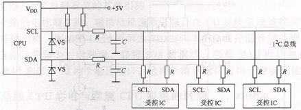 直接式I2C總線是指被控集成電路直接或通過(guò)電阻掛在I2C總線上,其電路工作原理圖如圖4所示。因?yàn)镃PU的I2C總線輸出端口內(nèi)部電路形式為集電極開路(或漏極開路)形式,所以在CPU的I2C總線輸出端必須通過(guò)上拉電阻R接+5V電源,為CPU的I2C總線輸出端口的內(nèi)部電路供電。圖4中的電阻R為隔離電阻,C為抗干擾電容,主要是為了提高I2C總線上數(shù)據(jù)傳輸?shù)目煽啃?,防止誤動(dòng)作進(jìn)人維修狀態(tài)和防止由于外部干擾信號(hào)改變I2C總線數(shù)據(jù)。穩(wěn)壓管VS是為了防止外部高電壓損壞CPU的I2C總線輸出端的內(nèi)部電路。