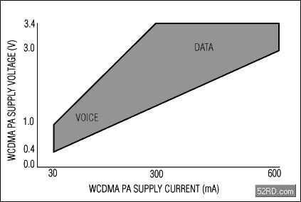 圖2.固定增益的雙極型W-CDMA功率放大器的典型負(fù)載曲線中有一個(gè)明顯的阻性成分。電源電壓和電流會(huì)從最低的0.4V/30mA(12mW)變化到最高的3.4V/600mA(2040mW),話音的發(fā)送一般在1.5V/150mA(225mW)下進(jìn)行,高速數(shù)據(jù)的發(fā)送一般在2.5V/400mA(1000mW)下進(jìn)行。