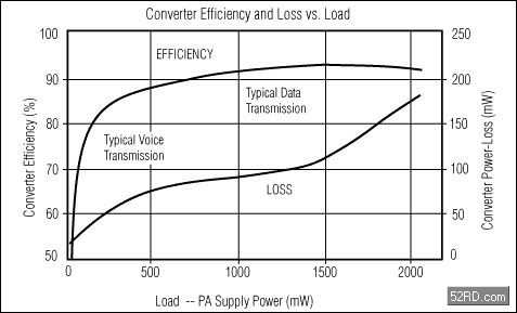 在很寬的負(fù)載范圍內(nèi)具有高效率—沒(méi)有高效率,采用開(kāi)關(guān)型調(diào)節(jié)器就失去了意義,因此,高效率和省電是MAX1820的主導(dǎo)設(shè)計(jì)思想(見(jiàn)圖3)。傳送數(shù)據(jù)時(shí)(約500mW至2040mW),MAX1820內(nèi)部的低導(dǎo)通電阻(0.15Ω)PFET功率開(kāi)關(guān)可以提供高達(dá)93%的效率。傳送話音時(shí)(約12mW至500mW),MAX1820內(nèi)部的0.2ΩNFET同步整流器和3.3mA的低工作電流(強(qiáng)制PWM模式)使轉(zhuǎn)換效率達(dá)到85%。85%的效率聽(tīng)起來(lái)不算太高,但對(duì)于一個(gè)工作在1MHz恒定開(kāi)關(guān)頻率和很輕負(fù)載的轉(zhuǎn)換器來(lái)講確非易事,正如圖3所示,轉(zhuǎn)換器具有極低的功率損耗。這要?dú)w功于優(yōu)秀的設(shè)計(jì)和亞微米工藝的采用,這種工藝能夠在給定的FET導(dǎo)通電阻下獲得更低的柵極電容。