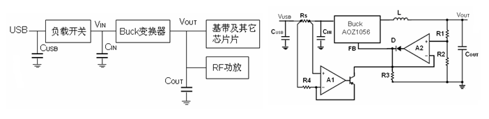 圖1b所示電路需要用二個運(yùn)放,A1用于檢測輸入電流,A2用于隔離電壓和電壓反饋信號,以保證電壓和電壓反饋信號中只有其中的一個信號參與系統(tǒng)的反饋工作。二極管D防止運(yùn)放A2的輸出管腳出現(xiàn)灌入電流。請注意,在輸出瞬態(tài)過載時,降壓變換器工作于恒流及限流模式,但仍輸出電流。在輸出瞬態(tài)過載期間,降壓變換器仍可以提供一定比例的輸出電流給射頻模塊,因此所需的輸出超級電容值可以減小。若限流值為0.5A,則輸出超級電容值可以減小25%。