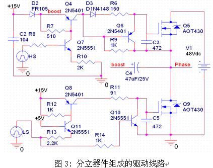 B.分立器件驅(qū)動電路用的器件較多,可靠性相對沒有半橋芯片的驅(qū)動電路高。但前提條件是半橋驅(qū)動芯片的驅(qū)動電路要設(shè)計合理。