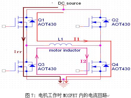 延長MOSFET的開通時間可以減小開通時的涌入電流。由于電機負載為感性負載,所以在PWM關(guān)斷時存在續(xù)流現(xiàn)象(見圖7中的I2),為了減小續(xù)流側(cè)反向恢復(fù)電流(Irr)的大小,PWM側(cè)開關(guān)管的開通速度不宜過快。由于MOSFET處于飽和區(qū)時有公式:Id=K*(Vgs-Vth)2,(K為一常數(shù),由MOSFET的特性決定)。所以在一定的溫度和Vds條件下,從MOSFET的門極驅(qū)動電壓Vgs可以判斷MOSFET中的電流大小。圖5中Vgs峰值為9.1V,圖6中Vgs峰值為6.4V,所以增加電容使得峰值電流減小。Id也可從MOSFET的轉(zhuǎn)移特性圖中獲得。