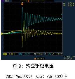 由于MOSFET的封裝電感和線路的雜散電感的存在,在MOSFET反向恢復(fù)電流Irr突然關(guān)斷時,MOSFET(Q3)上的電壓Vds會出現(xiàn)振鈴(如圖8中CH2所示)。此振鈴的出現(xiàn)會導(dǎo)致Vds超過MOSFET的擊穿電壓從而發(fā)生雪崩現(xiàn)象。如果線路中出現(xiàn)振鈴,我們可以通過以下方法來減小振鈴: