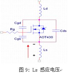 感應(yīng)柵極電壓如圖8中的CH1所示,其值已達到2.3V。另外,由于源極引線電感的存在,在Q3內(nèi)的電流迅速減小時,會在Ls的兩端感應(yīng)出一個極性為上負下正的電壓,如圖9所示,此時加在DIE上的電壓Vgs(die)要大于在外部引腳上測量的Vgs電壓,所以由于Ls的影響,使得MOSFET有提前導(dǎo)通的可能。如果下管由于感應(yīng)電壓而導(dǎo)通,則會造成上下管穿通,如果MOSFET不能承受此穿通電流,MOSFET就會損壞。