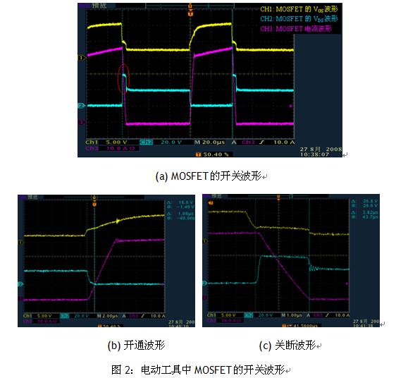 圖2為電動(dòng)工具中MOSFET(AOT500)的開(kāi)關(guān)波形。