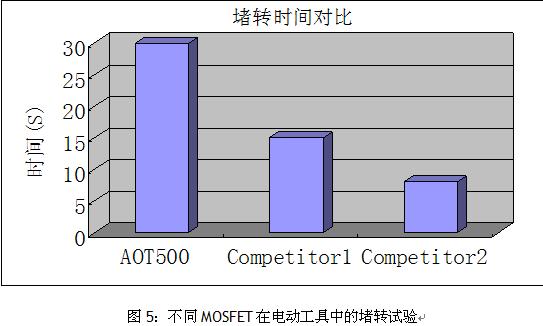 圖5為AOT500在電動(dòng)工具中的堵轉(zhuǎn)試驗(yàn)時(shí)間對(duì)比,可以看出,AOT500能承受的堵轉(zhuǎn)時(shí)間比其它的電動(dòng)工具常用的MOSFET要長(zhǎng)很多,大大提高了電動(dòng)工具的可靠性。