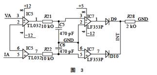 電壓信號VA和電流信號IA經(jīng)與微電平信號REF比較,取得電壓和電流信號的正半周;經(jīng)RC濾波后由信號“或”電路,形成含有功率因數(shù)角的信號;由單片機去除其中的電壓半周期,即得功率因數(shù)角。