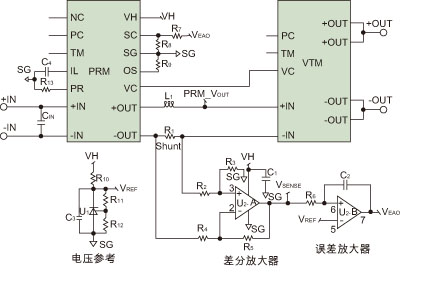 上述電路由電壓參考、分流電阻、差分放大器和誤差放大器組成。低端檢測(cè)電路是在PRM輸出端用配置為差分放大器的一個(gè)運(yùn)放實(shí)現(xiàn)的。分流電阻(R1)上的電壓經(jīng)檢測(cè)并被放大電阻R2到R5確定的增益倍數(shù)。參考電壓使用精確可調(diào)的分流參考產(chǎn)生,并連接到誤差放大器的同相端子。這是誤差放大器用以與差分放大器輸出(VSENSE)比較的電壓。誤差放大器的輸出(VEAO)經(jīng)過電阻R7和R8連接到SC,從而實(shí)現(xiàn)PRM輸出設(shè)置點(diǎn)的調(diào)整。誤差放大器將調(diào)整PRM輸出電壓,直到VSENSE等于參考電壓VREF。這將迫使VTM輸入電流以及VTM輸出電流成為由VREF確定的常數(shù)。