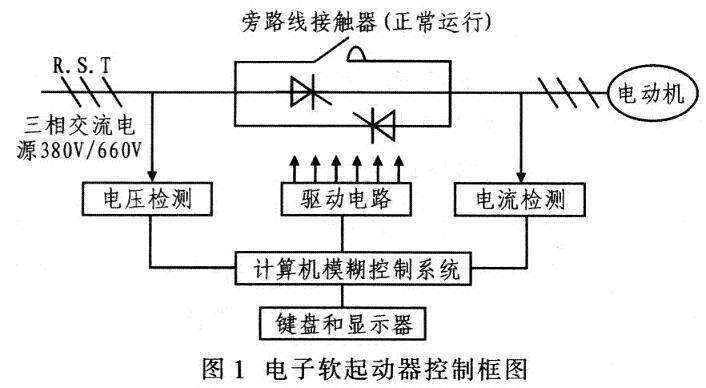 軟起動有磁控降壓軟起動器和電子軟起動器。其中,磁控降壓軟起動采用控磁限幅調(diào)壓方式減壓調(diào)控電動機起動時的電壓,實質(zhì)就是電抗器降壓起動。電子軟起動器有晶閘管調(diào)壓軟起動和變頻器調(diào)速軟起動。晶閘管調(diào)壓軟起動器的主回路采用6只晶閘管兩兩反向并聯(lián)組成的調(diào)壓電路,并焊接于電動機的三相供電線路。當起動器的微機控制系統(tǒng)接收到起動指令后進行有關(guān)計算。輸出晶閘管的觸發(fā)信號,通過控制晶閘管的導(dǎo)通角起動器按所設(shè)定的模式調(diào)節(jié)輸出電壓,從而控制電動機的起動。當電動機起動完成后,起動器吸合旁路線接觸器,使晶閘管短路,電動機直接投入電網(wǎng)運行,避免不必要的電能損耗。圖1為電子軟起動器控制框圖。