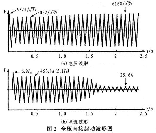 圖2為全壓直接起動的電壓、電流波形。由圖2(a)電壓波形可見,電動機起動前系統(tǒng)電壓為