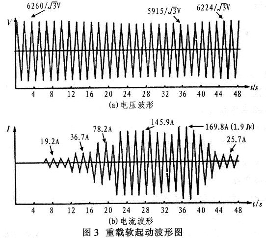 圖3為重載軟起動的電壓、電流波形。從圖3(a)電壓波形可見,電動機起動前系統(tǒng)電壓為