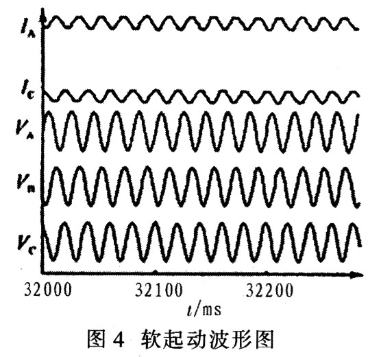 通過對比驗證看出,用軟起動效果遠好于常規(guī)起動,雖然在起動過程中,起動電流中含有一定的高次諧波,而電壓中卻只有很小的高次諧波,電壓的總諧波畸變率為2.72%,如見圖4所示,所以并不會對系統(tǒng)造成影響。