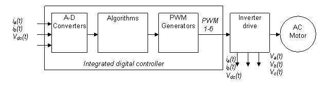 圖 1 是通用數(shù)字馬達控制系統(tǒng)的結構簡圖。算法可在數(shù)字控制器上實施,數(shù)字控制器生成的控制輸出可通過逆變器驅動馬達。電流及電壓測量等反饋信號通過模數(shù)轉換器 (ADC) 反饋至該算法。