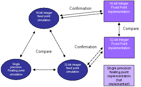 圖 4.16 位定點、32 位定點及浮點仿真結果。