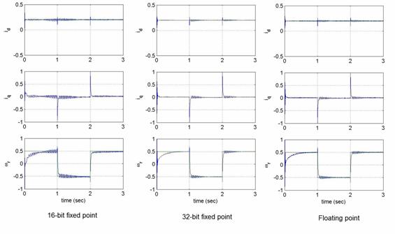 要比較三種數(shù)據格式對數(shù)值精度的影響,需要監(jiān)控估計速度響應與相應的d 及q 軸參考電流。將所有的PI 增益、參數(shù)、基本量在全部三種數(shù)據格式的仿真過程中設定為相同的有效值。從圖4 可以看出,16位定點版本與浮點版本的性能具有極大的差別。