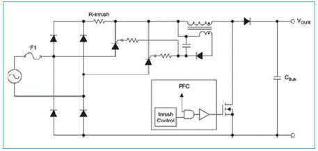 馬達電路首次通電時,電流首先流經(jīng)橋接整流器、浪涌電阻,然后流至大容量電容器。在該電容器處,浪涌電阻對電流進行了限制。一段時間之后(時間長短通常取決于 PFC 控制器電路),電流開始流動。電流流動時,PFC 控制器開始開關(guān)功率 MOSFET,而 MOSFET 反過來啟動升壓電感中的脈沖電流。然后,這一脈沖電流會在輔助繞組上產(chǎn)生一個浮動非穩(wěn)壓電壓,這一電壓用于觸發(fā)兩只 SCR 的柵極電路。兩只 SCR 以如下方式布置在電路中:提供一條電流通道,這條通道繞過橋接整流電路中的兩只整流器以及浪涌電阻。在電路中無需額外增加串聯(lián)元件的情況下,上述所選路徑即可為電流提供一條非常高效的通道。雖然 SCR 的正向壓降 (Vf) 比整流二極管稍大,但是固定阻值電阻或 NTC 等限流組件兩端的壓降已經(jīng)消除。此外,SCR 散發(fā)的熱量可由散熱片予以消除(經(jīng)由 SCR 的機架),而 NTC 無法做到這一點。這種散熱能力可使器件在更適宜的環(huán)境下運行,從而實現(xiàn)更高的系統(tǒng)穩(wěn)定性和 MTBF 值。