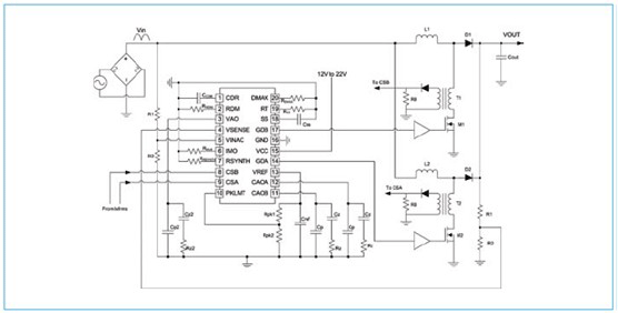 圖 3 顯示了業(yè)界首款單芯雙相交錯式 PFC 預(yù)調(diào)節(jié)器——TI UCC28070 的簡化原理圖。交錯雙相相互之間的相位差為 180°,這樣則消除了波紋電流,從而可以使用更小的電磁干擾 (EMI) 濾波器以及外觀更小巧的 PFC 輸出電容器。雙相交錯式拓撲結(jié)構(gòu)、體積更小的元件是嵌入式馬達驅(qū)動電路的理想解決方案。交錯式 PFC 可滿足非常高的功率密度要求。
