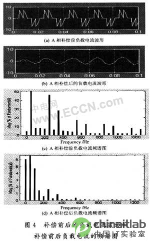 為了驗(yàn)證上述諧波檢測(cè)和控制方案的有效性以及由此構(gòu)成的基于DSP的并聯(lián)型有源電力濾波器是否能很好地補(bǔ)償諧波和無功電流,本文進(jìn)行了實(shí)驗(yàn)。采用阻性負(fù)載作為三相不控橋式整流器的負(fù)載,試驗(yàn)中在負(fù)載側(cè)接了1個(gè)2Ω的電阻。下面以A相為例給出實(shí)驗(yàn)波形。圖4分別給出了補(bǔ)償前后的負(fù)載電流波形和補(bǔ)償前后負(fù)載電流的頻譜圖。