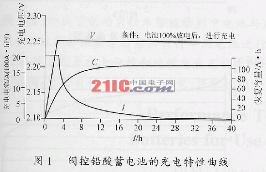 以國內(nèi)外使用最多也最為普遍,研究分析也最為深刻的鉛酸蓄電池為例。請(qǐng)觀察一幅在研究閥控式鉛酸蓄電池技術(shù)方面,經(jīng)??吹胶陀玫降膱D1。這里我們要說明的是,這幅圖是專家們拋開日常環(huán)境溫度變化對(duì)蓄電池充電過程的影響,用經(jīng)過改進(jìn)的恒壓限流方法對(duì)蓄電池充電所獲得的。因是恒壓限流充電方式,所以代表電流變化的I線,起始段有一小段是限流值。代表電壓的V線起始段是一段很陡的上升線,更確切地講由于充電器的限流作用應(yīng)是電壓的下跌線。