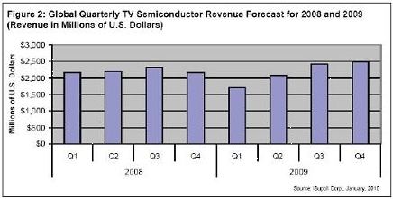 2010年市場更加接受互聯(lián)網(wǎng)驅(qū)動、支持LED背光和100/120Hz幀速率轉(zhuǎn)換技術(shù)等功能的先進電視,將有利于推動電視半導(dǎo)體市場達到新的高度。iSuppli公司目前預(yù)測,2010年電視半導(dǎo)體營業(yè)收入將比2009年增長19%。
