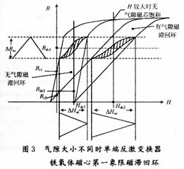 與正激開關(guān)電源變壓器不同,此反擊電源變壓器兼有儲(chǔ)能的作用,流過直流電流成分時(shí)容易飽和。所以要使用帶有氣隙的磁芯。原理如圖3所示。
