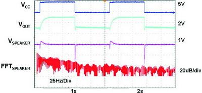 即電容充放電產(chǎn)生的電流。圖2揭示了當(dāng)耳機(jī)驅(qū)動(dòng)器上電和斷電時(shí),隔直電容充放電電流在耳機(jī)負(fù)載上產(chǎn)生的電壓瞬變,由于該電壓瞬變的頻譜很寬,落在人耳可以的聽到頻率范圍內(nèi)就形成了爆破音。