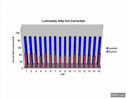 為了提供像點(diǎn)修正功能,制造商會(huì)透過(guò)畫(huà)面擷取測(cè)量每顆LED的亮度,再將系統(tǒng)最暗的LED指定為基準(zhǔn)LED,然后將其它像素的亮度調(diào)整成和基準(zhǔn)LED相同;調(diào)整方式則是根據(jù)LED輸出亮度將每個(gè)像素的電流減少一定比例。德州儀器(TI)的TLC5940或其它類(lèi)似元件都會(huì)將每顆LED的像點(diǎn)修正值儲(chǔ)存在晶片內(nèi)建的EEPROM記憶體,或是在每個(gè)更新週期當(dāng)中做動(dòng)態(tài)修改。這種雙重像點(diǎn)修正方式很有彈性,它既能在外界照明條件改變時(shí)更新整個(gè)面板的亮度,又能提供長(zhǎng)期保存像點(diǎn)修正資訊以確保面板亮度均勻。只要像素亮度隨時(shí)間出現(xiàn)變化,或是面板因?yàn)楣收隙枰{(diào)整和更換,工程人員隨時(shí)都能更新EEPROM資料。我們將用下列例子來(lái)說(shuō)明這種做法。