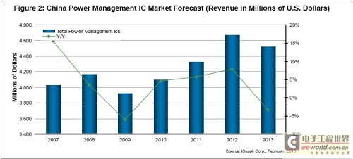 據(jù)iSuppli公司,繼2009年經(jīng)濟成長放緩之后,預(yù)計未來幾年中國電源管理IC(PMIC)市場將強勁擴張,吸引更多的國內(nèi)企業(yè)加入。