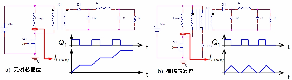 圖1:正激轉(zhuǎn)換器不帶磁芯復(fù)位與帶磁芯復(fù)位之對比。