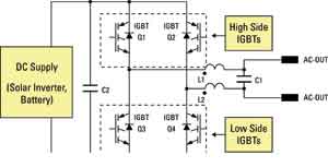 因為這個設(shè)計所實施的逆變器拓?fù)鋵儆谌珮颍杂嘘P(guān)的太陽能逆變器采用了4個高電壓IGBT,如圖1所示。在這個電路中,Q1和Q2晶體管被指定為高側(cè)IGBT,而Q3和Q4則為低側(cè)功率器件。為了要保持總功率耗損處于低水平,但功率轉(zhuǎn)換則擁有高效率,設(shè)計師要在這個DC/AC逆變器解決方案正確應(yīng)用低側(cè)和高側(cè)IGBT組合。