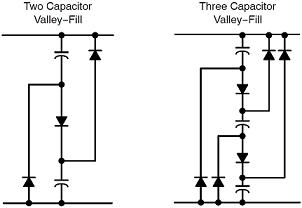 業(yè)界有關(guān)無源(Passive)功率因數(shù)校正(PFC)的方案眾多,這些方案通常都使用較多的額外元器件,其中的一種方案就是谷底填谷(valley-fill)整流器,其中采用的電解電容和二極管組合增大了線路頻率導(dǎo)通角,從而改善功率因數(shù)。實際上,這個過程利用高線路電壓以低電流給串聯(lián)電容充電,然后在較低電壓時以較大電流讓電容放電給開關(guān)穩(wěn)壓器。典型應(yīng)用使用2個電容和3個二極管,而要進(jìn)一步增強功率因數(shù)性能,則使用3顆電容和6個二極管。