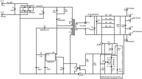 安森美半導(dǎo)體的NCP1014LEDGTGEVB評估板經(jīng)過了優(yōu)化,可以驅(qū)動1到8顆大功率高亮度LED,如CreeRebel、SeoulSemiconductorZ−Power®或OSRAMGolden?XR−E/XP−E、Luxeon™?XLAMP®Dragon™。這設(shè)計基于集成了帶內(nèi)部限流功能的高壓電源開關(guān)的緊湊型固定頻率脈寬調(diào)制(PWM)轉(zhuǎn)換器NCP1014構(gòu)建。由于NCP1014采用固定頻率工作,電流不能上升到高于某個特定點;這個點由輸入電壓及開關(guān)周期或?qū)〞r間結(jié)束前的初級電感來確定。由于導(dǎo)通時間的限制,輸入電流將跟隨輸入電壓的波形,從而提供更高的功率因數(shù)。相關(guān)電路圖見圖2。