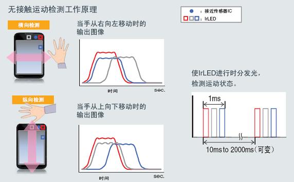 Rohm公司的另一個(gè)重要的產(chǎn)品是單片光學(xué)式接近傳感器/照度傳感器芯片BH1771GLC。Rohm公司設(shè)計(jì)中心所長(zhǎng)福田明介紹,“BH1771GLC在單芯片上安裝有檢測(cè)可見(jiàn)光的光電二極管和檢測(cè)紅外光的光電二極管,在感知1cm ~ 10cm 程度的接近的同時(shí),作為照度傳感器可以檢測(cè)0 ~ 65,000Lux。而且,擴(kuò)大距離傳感器功能,安裝了業(yè)界首創(chuàng)無(wú)接觸動(dòng)作檢測(cè)功能。所謂無(wú)接觸動(dòng)作檢測(cè),即以BH1771GLC驅(qū)動(dòng)多個(gè)紅外線LED(最多3 個(gè)),檢測(cè)各個(gè)LED 的反射光相位偏差,并感知反射物(人的手)的動(dòng)作方向的功能。如果使用這一功能,不需要直接接觸顯示器,在距離顯示屏5cm 左右的高度通過(guò)揮手動(dòng)作也能操作。借此,即使沒(méi)有安裝觸摸顯示屏的顯示器設(shè)備也可以進(jìn)行動(dòng)作操作。”可以想象,采用該方案過(guò)后,不用接觸屏幕或按鍵就可以實(shí)現(xiàn)翻頁(yè)、換歌,或?yàn)g覽網(wǎng)頁(yè)的功能,這對(duì)手機(jī)制造商來(lái)說(shuō)無(wú)疑是個(gè)絕佳的創(chuàng)新賣點(diǎn)。